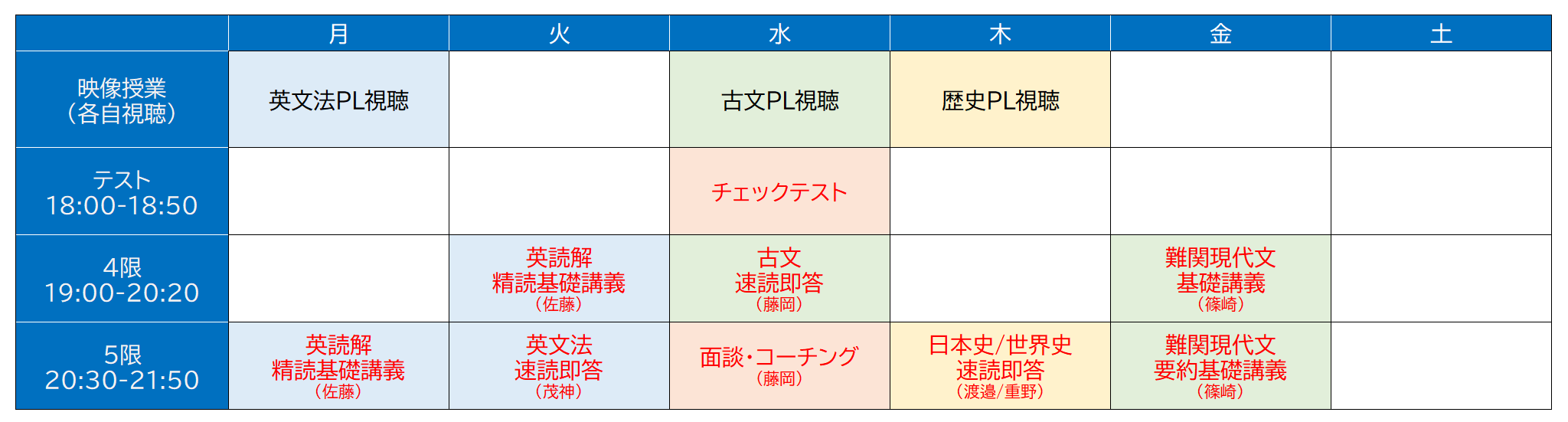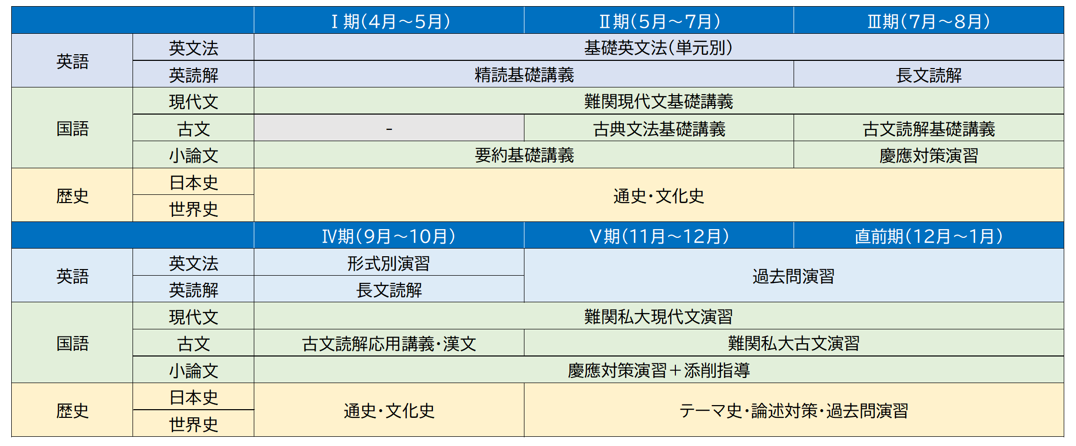 受験で配点の高い英語と、暗記が重要になる選択(日本史・世界史)にウエイトを割いたカリキュラム。 国語は現代文と要約の学習から始め、6月以降に古文を追加。学習の負担を分散させています。