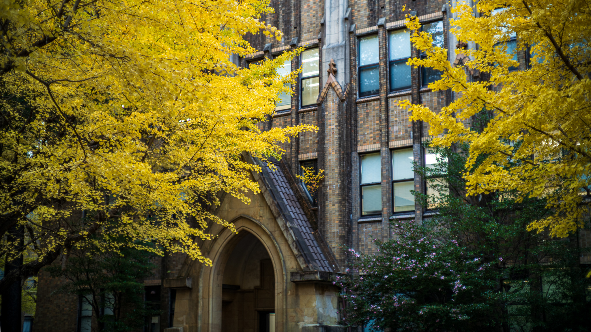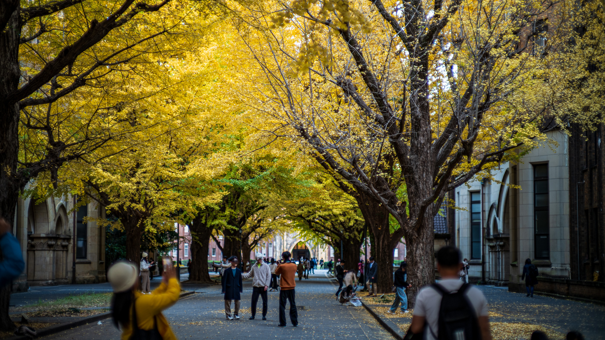 正門から安田講堂へと続く銀杏並木は、紅葉シーズンには圧巻の美しさを魅せてくれます。11月下旬~12月になると、辺り一面が黄金色の絨毯で敷き詰められ、幻想的な風景が広がります。