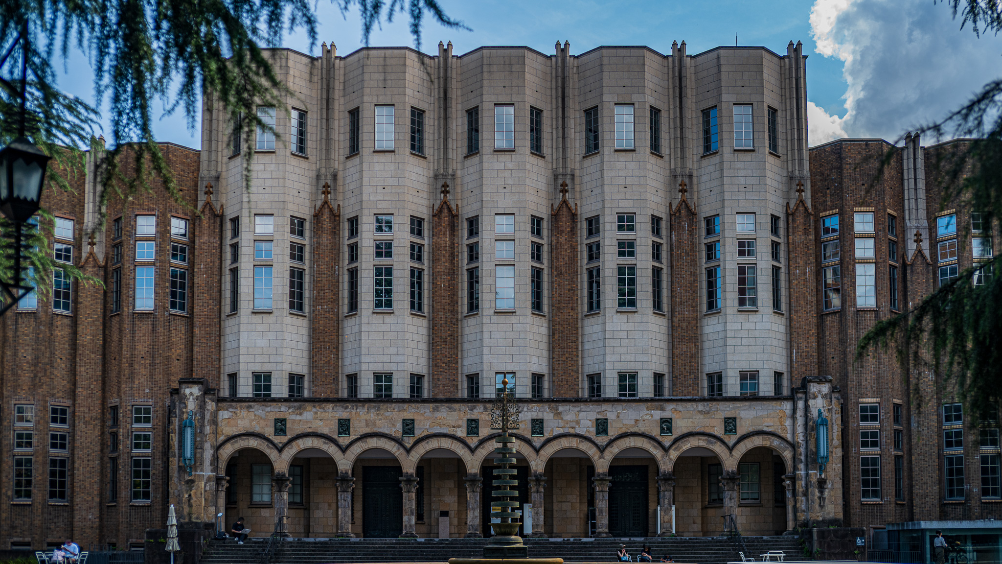 建物の頂上にある時計台が特徴的で、縦の線を強調した「内田ゴシック」と呼ばれる独自の建築様式で設計されています。これは、震災からの復興のシンボルとして、力強く天に向かって伸びるデザインが意図されたものです。講堂内部には約1,100席のホールがあり、地下には中央食堂が設けられています。