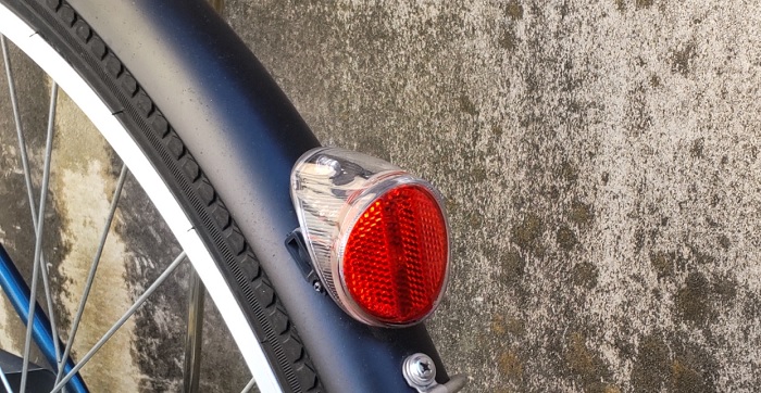反射板といえば、自転車のうしろにもついていますね。タイヤの上のほうに赤いものがついています。