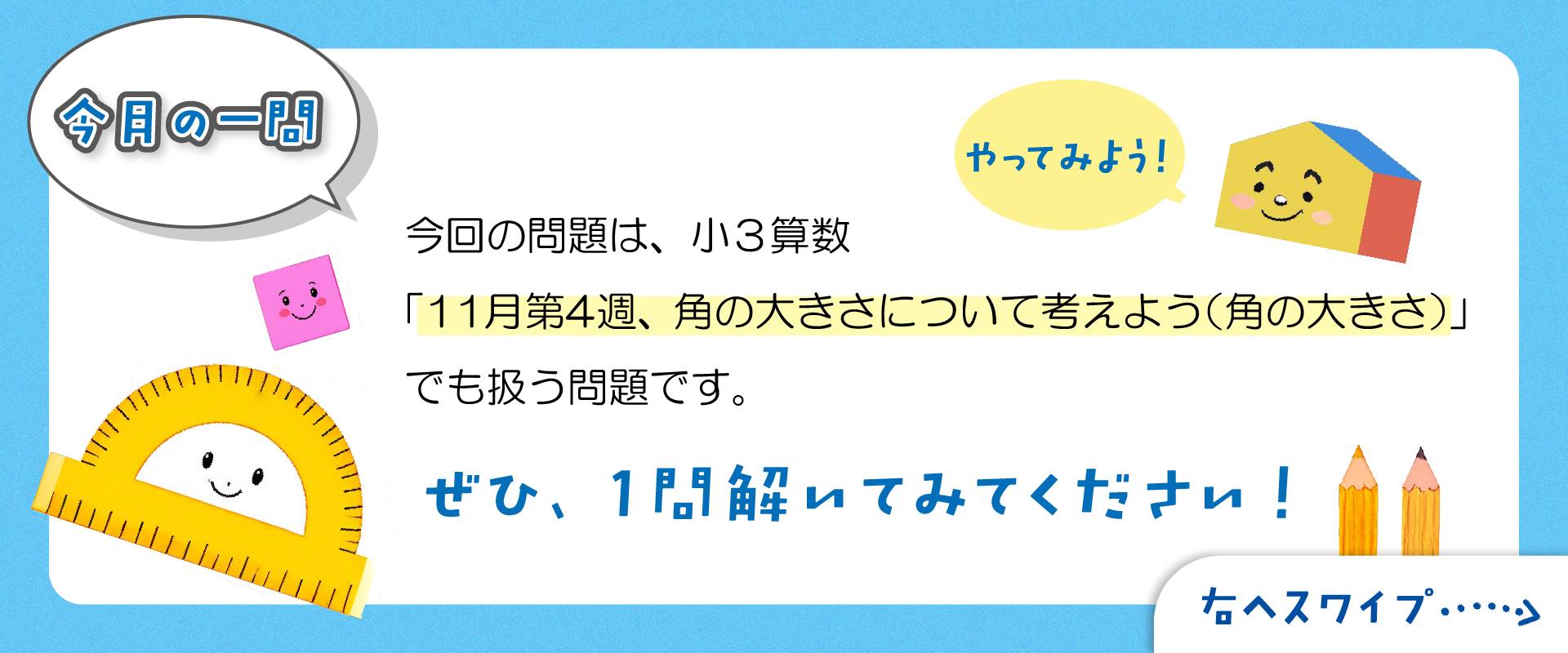少しずつ肌寒い日が増えてきましたが、みなさん体調はいかがですか? インフルエンザも流行の時期です。手洗い・うがいをしっかりして元気に過ごしましょう! 11月からは、リンスタジュニアに新しく「年長コース」が開講しました。小学校に向けて楽しく学ぶ準備を進めていきます。無料の授業体験や、特別企画も行っております。お気軽にご連絡ください。 3年生のみなさんは、いよいよジュニアアタックテストの時期です。これまで学んだことを振り返り、自信を持って挑戦してくださいね。 今月も、みなさんの「できた!」「わかった!」がたくさん生まれる授業にしていきましょう!