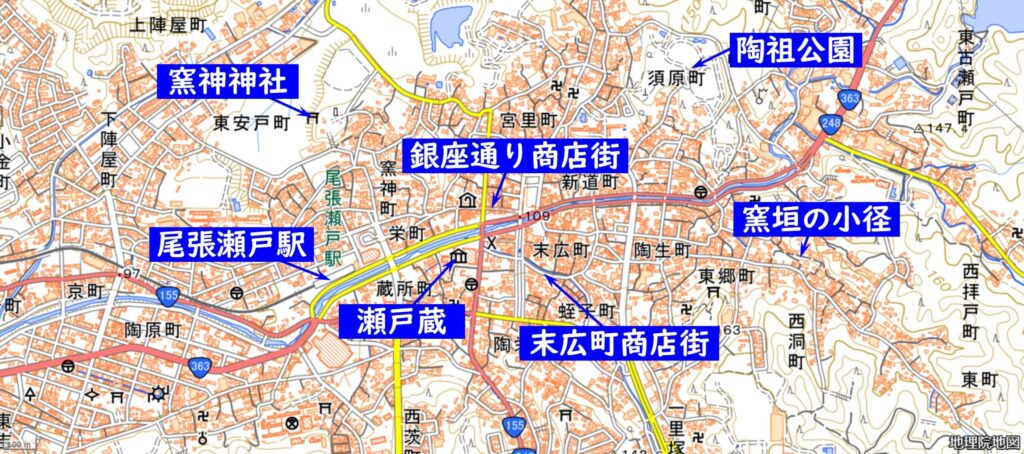 茶碗やお皿、湯飲みやカップなどのことを〝せともの〟と呼ぶことがあります。〝せともの〟は漢字で書くと「瀬戸物」になり、本来は愛知県瀬戸市で生産された焼き物のことをいうのですが、焼き物全般を表す言葉として〝せともの〟が使われているのです。つまり、愛知県瀬戸市は、日本を代表する焼き物の産地ということですよね。今回は、そんな瀬戸市を訪ねてみることにしました。 瀬戸市は、名古屋の東約20㎞のところにある、人口約12万人の都市です。下の地図からもわかるように、市の東側は山間部となっており、瀬戸市の中心部も南北の山に挟まれた川沿いに位置しています。