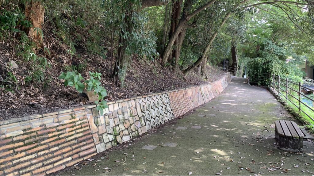 商店街を抜け、緩い坂道を登って歩くことおよそ15分、右側の崖沿いに細い道の入り口がありました。この道は〝窯垣の小径〟と呼ばれており、下の写真のような塀が特徴的な道です。この塀は、窯で陶磁器を焼くときに使われた古い道具などを積み上げて築いたもので、これを窯垣というのです。