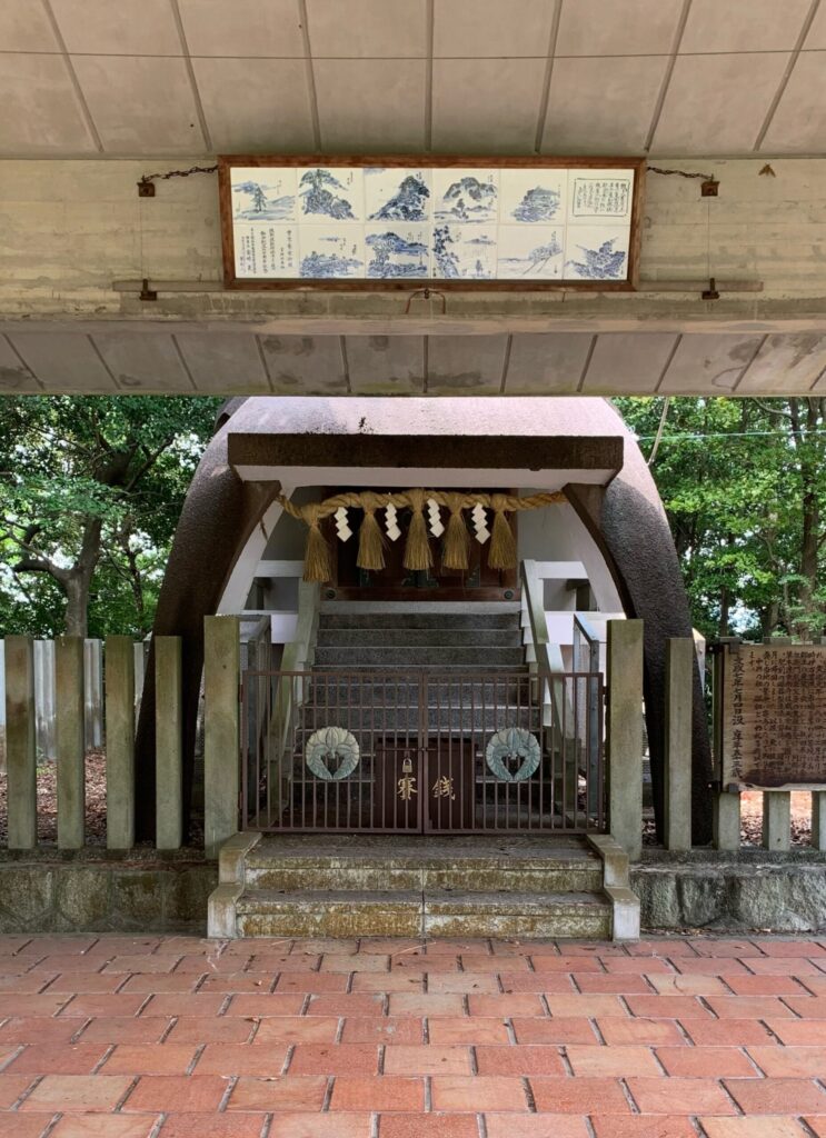 途中で止まると心が折れそうなので、一気に階段を登ったその先には、下の写真のような不思議な形をした社殿を持つ神社がありました。このデザインは、焼き物づくりに使われていた丸窯を模したものなのだそうです。焼き物の街の神社にふさわしいデザインなのでしょうが、なんとなく違和感を覚えたのも事実です。社殿の横には加藤民吉の像もありました。