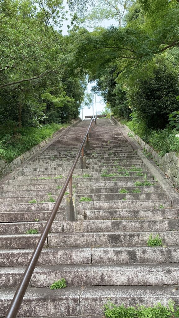 商店街を抜けると右に折れ、少しずつ坂を上っていきます。坂の途中には、焼き物の工場もありました。勾配は徐々にきつくなっていき、息が切れてきた私の目の前に現れたのが、下の写真の絶望的な階段です。ここまで来て引き返すわけはいきませんので、意を決して階段を上っていきます。