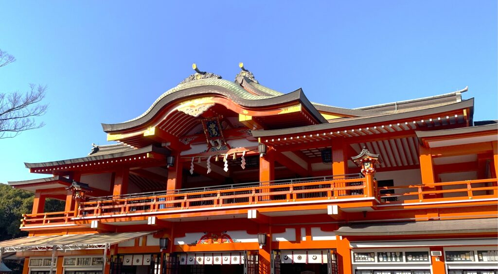 千葉県内でも屈指のパワースポットとして、古くから厚い信仰を集めています。北極星・北斗七星は「運命の道標」とされるため、厄除けや開運のご利益があるそうです。源頼朝に協力したことで知られる千葉つねたねは、本拠地を現在の千葉市に移した際に、一族の心の拠り所として千葉神社を厚く保護し、門前町として街を発展させました。千葉氏は北斗七星を神格化した妙見様を一族の象徴とし、戦いの勝利を祈願したそうです。千葉神社の社殿は、下の写真のように2階建てになっており、1階と2階のどちらにも拝殿があります。これは全国的にも珍しい造りだそうです。この立派な社殿を見ると、なんだかご利益がありそうな気がしてきますよね。