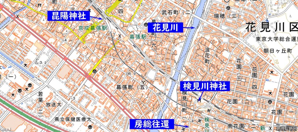 しばらく歩くと京成幕張駅に着きました。ここには、歴史のテキストに出てくる人物に関連するものがあります。それが下の写真の昆陽神社です。この神社は、さつまいもの栽培に成功したことで知られる青木昆陽を祀っています。なぜここに青木昆陽を祀った神社があるのでしょう? その答えは、この鳥居の向かい側にありました。青木昆陽はいくつかの場所でさつまいもの栽培の試験をおこないましたが、唯一成功したのがこの土地なのだそうです。その後、この地ではさつまいもがさかんにつくられるようになり、そのおかげで江戸時代最大といわれる天明の飢饉のときにも1人の犠牲者も出なかったのだそうです。