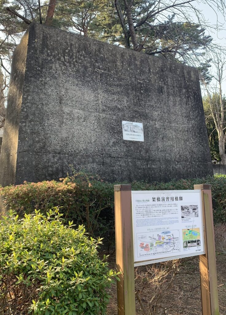 ここから京成線と総武線の線路を越えて東に向かいます。 目指したのは千葉公園。実はこの公園、最初に出てきた鉄道連隊の演習場の跡地につくられた公園なんです。園内には、当時の様子を伝える貴重な戦争遺跡が点在しています。そのうちの1つが、下の写真の架橋演習用橋脚です。巨大なコンクリート製の柱は、橋を架ける訓練に使用されたそうです。習志野市から続いていた鉄道連隊の演習線は、ここまで伸びていたんですね。演習線は、現在の四街道市や佐倉市などを大きく迂回しているので、これに沿って歩いたら大変な距離になってしまいますけど…。