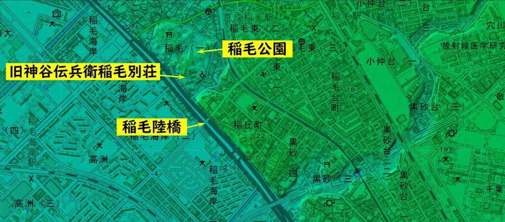 1時間ほど歩いて、京成稲毛駅の近くにある稲毛公園に着きました。公園は小高い丘になっており、園内には松林が広がっています。現在では埋め立てが進み、海岸線はここからおよそ3㎞先になっていますが、かつては、この公園のすぐ下が海岸線でした。海岸沿いには松林が広がっており、この公園はその名残になっているというわけです。