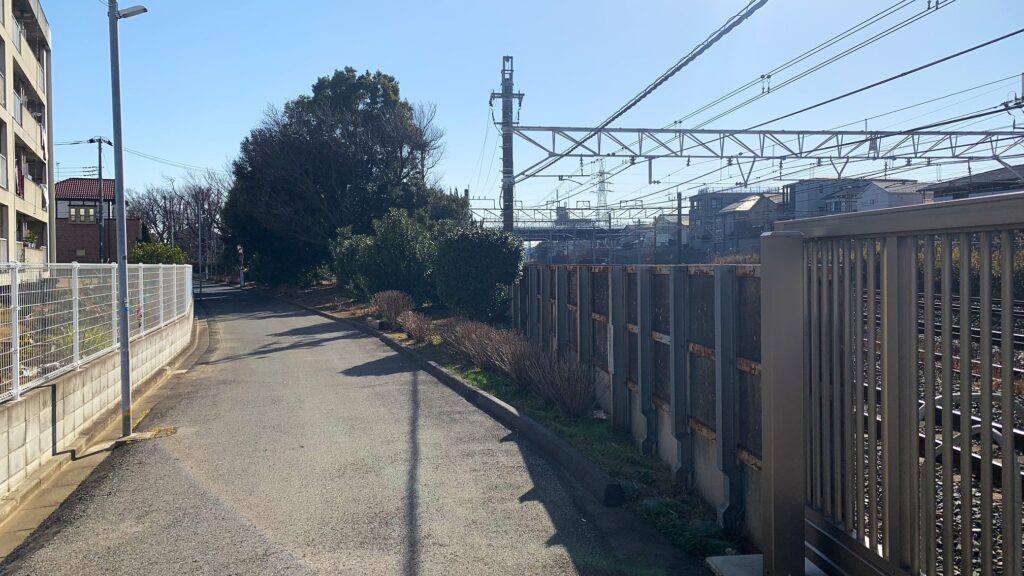 この道を進んでいったのでは目的地とは異なる方向に進んでしまいますので、少々複雑な住宅地の間の道を進み、再び総武線の線路沿いの道に出ます。線路に沿った道があればいいのですが、この付近は少々遠回りをしなくてはいけません。