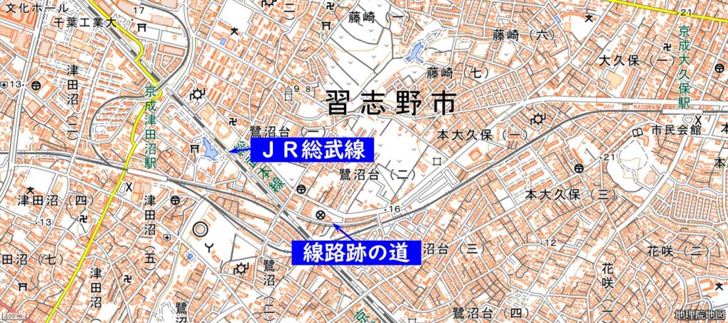 実はこの道、かつての線路跡なのです。以前のブログ(~千葉県船橋市ほか 変わりゆく風景編~)で、鉄道連隊のことを紹介しましたが、ここにはその線路がありました。ここから分岐した線路は、京成大久保駅の付近からいったん北上し、その後南東に向かって進んで千葉駅の近くまで伸びていたのだそうです。この先の線路跡は、遊歩道として整備されており、散歩やジョギングをしている人の姿も見ることができます。