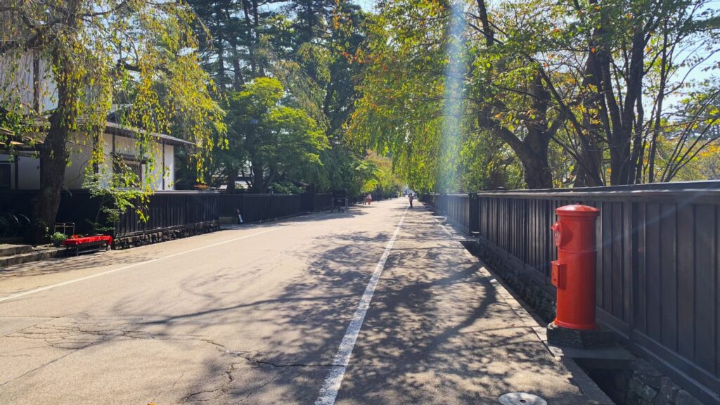 まずは、武家屋敷通りをひたすら北へ進んでいくことにします。先ほどの「火除け」が町人地との境ですから、進んでいくにつれて、そこで暮らす武士の身分も高くなっていくのでしょうね。さらに進めば、ここに暮らしていた武士たちの主君の住まいもあったのでしょう。通りは途中で行き止まりとなって、少し左側にずれてその先に続いています。これは、攻めてくる敵の勢いを弱めるための工夫で、こういうところにも武士の時代の名残を見ることができます。