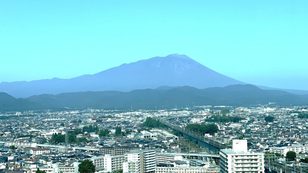 さて、盛岡駅近くのホテルに滞在していた私は、秋田新幹線こまち号に乗るために盛岡駅にやって来ました。予約していた列車の出発までまだ少し時間があります。そこで、西口にあるマリオスというビルの20階にある展望室フロアに行ってみることにしました。この日は晴天だったので、きっと岩手山の姿がきれいに見えると思ったのです。「南部富士」と呼ばれる岩手山は、岩手のシンボルとなっている火山です。展望台からの眺望は、下の写真のように期待通りのものでした。