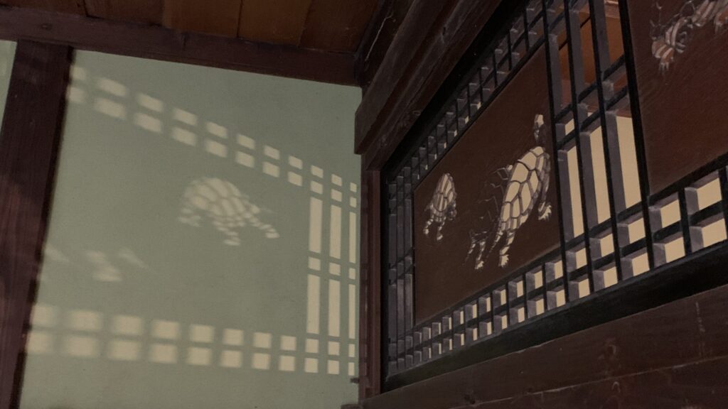 靴を脱いで室内に入ると、案内の方がいろいろと説明をしてくれます。下の写真は、欄間に施された亀の透かし彫りですが、左側には太陽の光によってその影が映し出されています。何とも魅力的な演出ですよね。