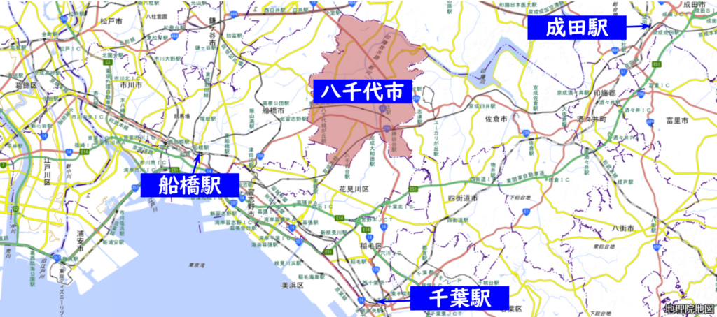 千葉県北西部にある八千代市は自然豊かなベッドタウンで、下の地図でもわかる通り、千葉県第一の都市である千葉市、第二の都市である船橋市と隣接し、成田空港へのアクセスも悪くありません。
