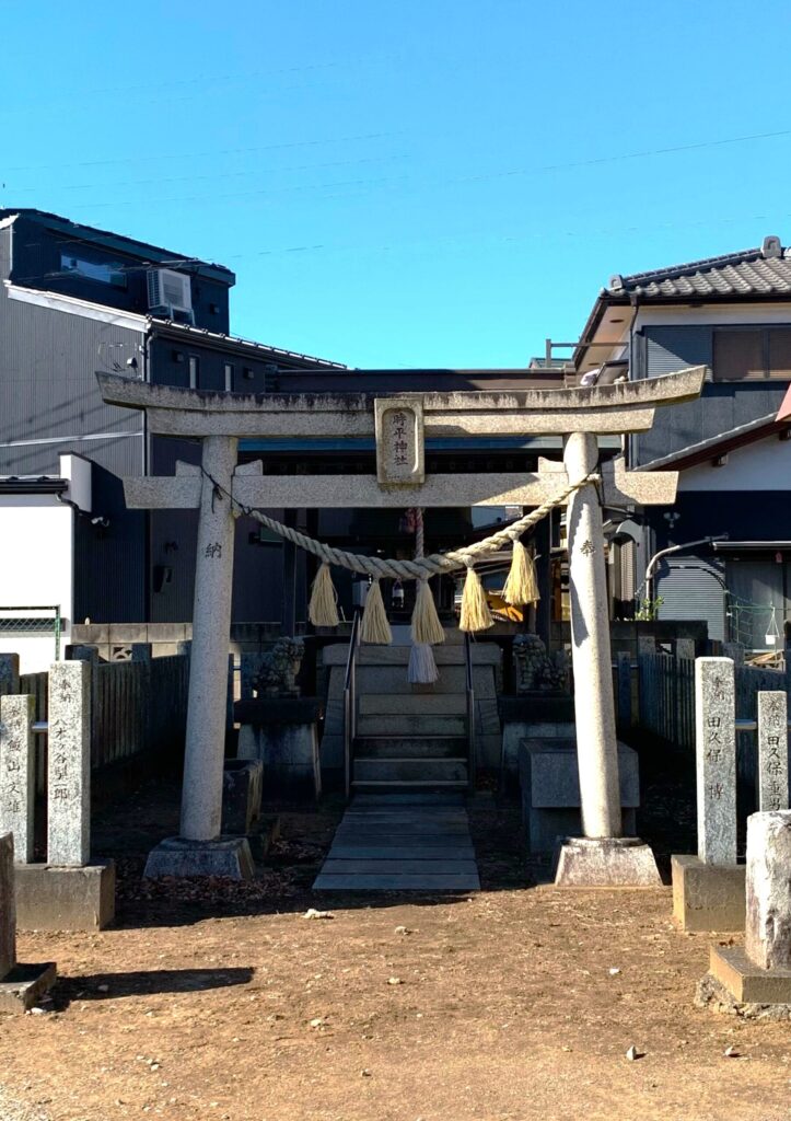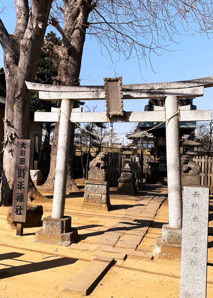 次の目的地までは成田街道を1㎞弱進めばいいのですが、歩道が狭くてとても歩きにくい道です。そこで、少し迂回することにはなりますが、細い住宅街の道を進んでいくことにしました。江戸時代のこのあたりには、成田街道の大和田宿がありました。今歩いている道沿いにも、昔からありそうな家がいくつか見られます。住宅街を歩くことおよそ13分、下の写真の大和田時平神社に到着しました。