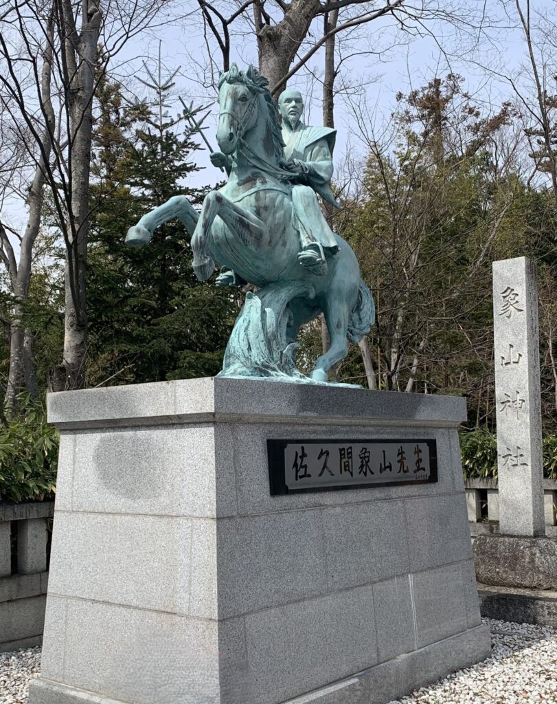 地下壕を出て、次に向かったのは象山神社です。この神社に祀られているのが佐久間象山で、鳥居の前には下の写真の銅像が置かれていました。象山の名は、先ほどの地下壕の近くにあった「象山恵明寺」にちなんだものだそうです。