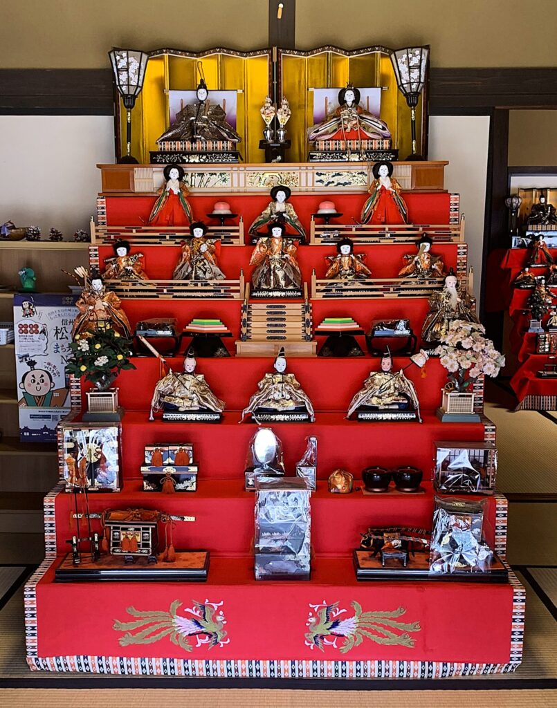 門を入ると右側には池のある庭園があり、その奥に玄関があるのですが、そこには下の写真のように立派な雛飾りが置かれていました。